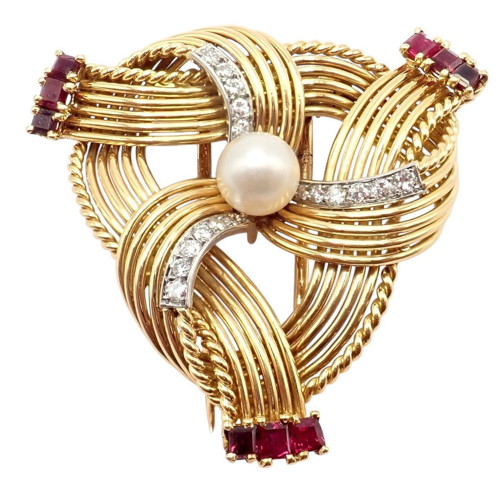 Accented with sparkling diamonds and vivid square-cut rubies, the piece is centered by a luminous pearl.