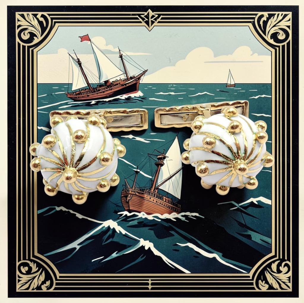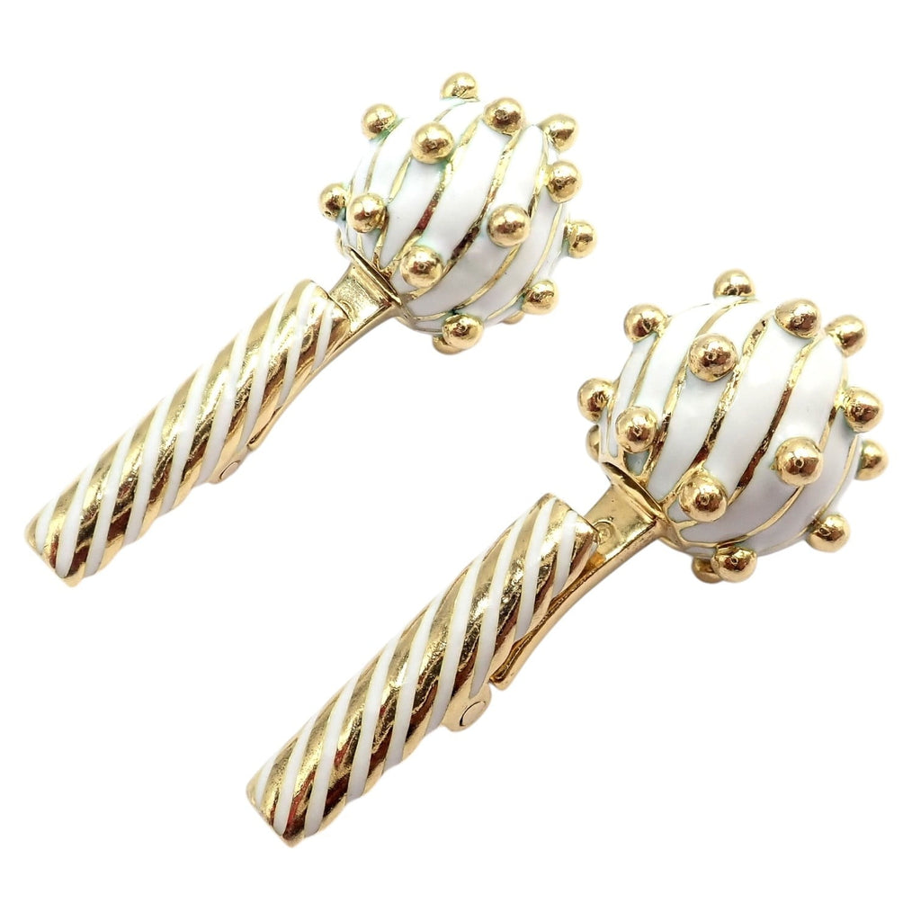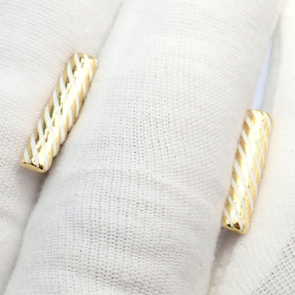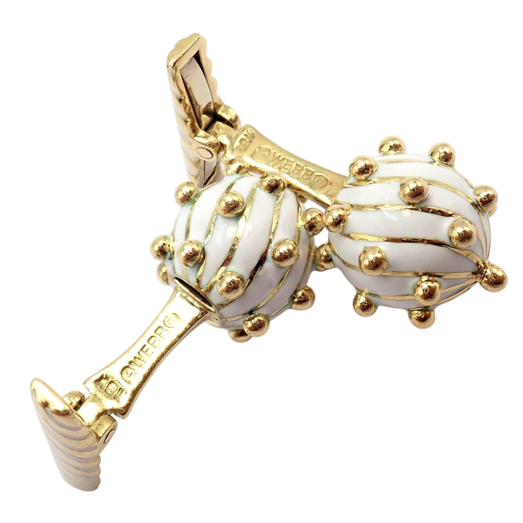 David Webb 18k yellow gold cufflinks feature bold white enamel spheres adorned with polished gold spike accents, creating a striking, dimensional design.